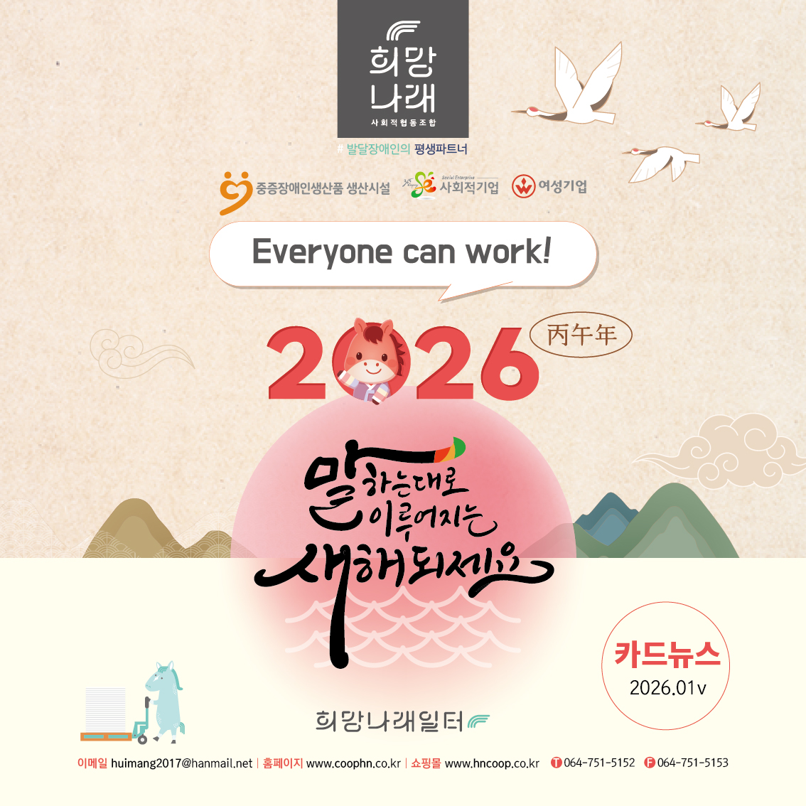 - "일이 커지고 삶이 열린다"... 사회적협동조합 희망나래, 2026년 장애인복지일자리사업 발대식 개최 2026.01.07